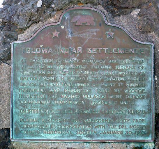 | Keywords: TolowaIndianSettlement Crescent City, CA.jpg 649 en California Registered Historical Landmark No 649 Site of old Indian Village at Pebble Beach Crescent City California California Registered Historical Landmark No 649 plaque reads Tolowa Indian Settlements At the time of white contact the principal villages of the native Tolowa Indians of northern Del Norte County were located at Battery Point in Crescent City Ta'atun Pebble Beach Meslteltun south of Point St George Tatintun and north of Point St George Tawiatun The major villages were almost completely independent economic units California Registered Historical Landmark No 649 Plaque placed by the California State Park Commission in cooperation with the Del Norte County Historical Society January 30 1965 original photo Ellin Beltz 2012-03-17 41 45 28 9 N 124 13 19 14 W region US Crescent City California Plaques in Del Norte County California Historical markers in Del Norte County California California Historical Landmarks plaques California Historical Landmarks in Del Norte County CaliforniaPhotographs by Ellin Beltz |