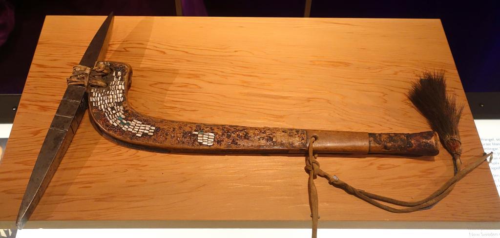 | Keywords: Tomahawk pickaxe, possibly from New Sweden, owned by Swedish Kings Charles X and XI, wampum inlay, with iron blade likely from later date - Etnografiska museet - Stockholm, Sweden - DSC01215.JPG en Exhibit in the Etnografiska museet Stockholm Sweden This work is old enough so that it is in the public domain Photography was permitted in the museum without restriction 2014-09-16 own Daderot other versions cc-zero North American collection in the Etnografiska museet Uploaded with UploadWizard |