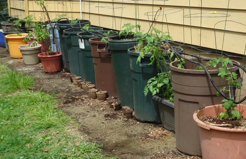 | Keywords: Tomato plants growing in garbage barrels alongside house.JPG en An arrangement of tomato plants in garbage barrels with plenty of soil alongside a house in New Jersey The barrels provide stability for the wire concentric ring supports; further they help keep the tomato plants off the ground making it harder for chipmunks and squirrels to eat the fruit when they appear A drip hose extends along the line of barrels Tomato plants need lots of sun but they can perish during a heat spell when temperatures are above 90F for extended periods; if this happens plants should be covered with plastic to keep moisture in and watered frequently This area of Summit New Jersey does not have many deer 2014-05-10 own Tomwsulcer cc-zero Uploaded with UploadWizard Solanum lycopersicum Gardening |