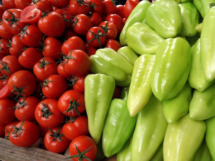 Keywords: tomatoes peppers vegetables food market plants green red kitchen eat colorful vegetale