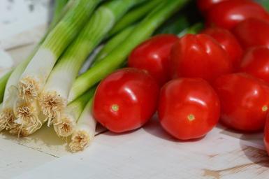 Keywords: tomatoes spring onions vegetables healthy vitamins frisch eat food bright red green bless you