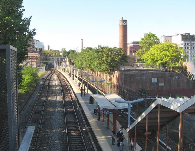 | Keywords: Tompkinsville Sta jeh.jpg en Looking north from Hannah Street overpass and down into en Tompkinsville Staten Island Railway station on a sunny afternoon This southern entrance closed a few months later having no turnstiles Own Jim henderson 2008-09-01 40 38 175 0 N 74 4 486 0 W heading NbW Tompkinsville Staten Island Railway station |