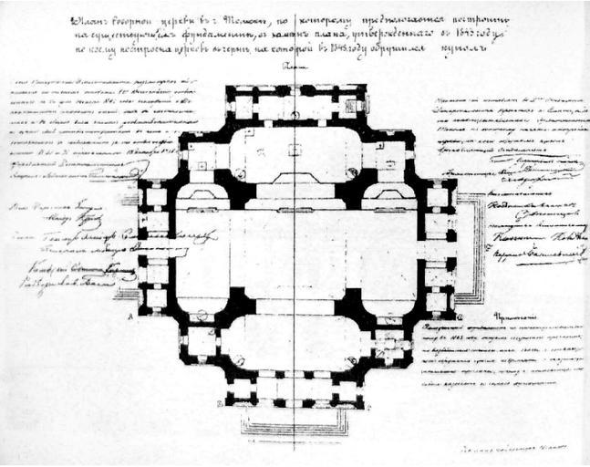 | Keywords: Tomsk plan after collapse.png План пе ест ойки Томского собо а в 1880-х годах Floorplan of the Tomsk cathedral 1880s reconstruction The original building designed by Konstantin Thon in 1837-1843 collapsed in 1850 and was rebuilt in 1880s to this plan А Г Туманик А хитекту а п авославных кафед альных собо ов Сиби и вто ой половины XIX века ИИТАГ 2004 http //ias ngaha ru/archive/Tumanik pdf ис 3 s 1880 Initial floorplans 1837-1843 Konstantin Thon; this amended floorplan Vladimir Khabarov d 1897 PD-Art-100 Holy Trinity Cathedral Tomsk Konstantin Thon |