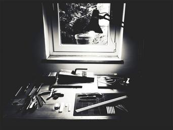 Keywords: tools supplies materials pliers razor blades xacto knife knives screw driver desk window lamp black and white workshop