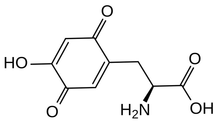 Keywords: Topaquinone structure.svg Uploaded with en wp UW marker 2015 06 16 Topaquinone structural formula Modelled using GNU BKChem 2015-06-16 Mintsmike cc-zero Cofactors Quinones Amino acids