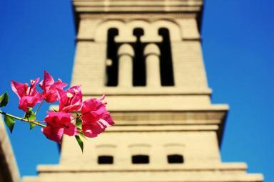 Keywords: torre monument medieval tower middle ages art culture flower flowers rosa nature spring bloom colorful color petals blue sky blue sky bricks