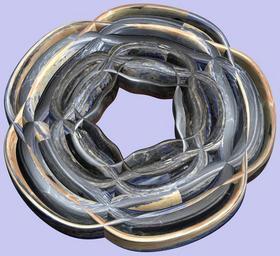 Keywords: mathematica 3d cg parametricplot3d texture torus code program algorithm プログラム コード アルゴリズム 輪環 りんかん ドーナツ どーなつ トーラス とーらす mapping テクスチャ マッピング 模様 もよう abstract 抽象 ちゅうしょう アブストラクト design pattern デザイン パターン graphic グラフィック グラフィクス structure 意匠 構造 symmetry 対称性 たいしょうせい シンメトリー 対称 たいしょう cable drawing white background a = 7; (* center hole size of a torus *) b1 = 2.5;(* the number of angles *) b2 = 4;(* the number of waves *) c = 0; (* distance from the center of rotation *) d = 1; (* the number of tori *) h1 = 3; (* width of a torus *) h2 = 1; (* width of a torus *) SetOptions[ParametricPlot3D, PlotRange -> Full, Mesh -> None, Boxed -> False, Axes -> None, PlotPoints -> 500, ImageSize -> 3000, Background -> RGBColor[{200, 200, 240}/255], PlotStyle -> Directive[Specularity[White, 70], Texture[Import["D:/tmp/94.jpg"]]], TextureCoordinateFunction -> ({#4, #5 Pi} &), Lighting -> "Neutral"]; f[v_] := Sin[2 Sin[Sin[Sin[v]]]]; x = (a - h1 Cos[t] + h2 f[b1 s]) Cos[s] + c; y = (a - h1 Cos[t] + h2 f[b1 s]) Sin[s] + c; z = f[b2 t]; rm = Table[{x, y, z}.RotationMatrix[2 i Pi/d, {0, 1, 2}], {i, d}]; ParametricPlot3D[rm, {t, 0, 2 Pi}, {s, 0, 4 Pi}] (*--- The Texture *) a = 7; (* center hole size of a torus *) b1 = 2.5;(* the number of angles *) b2 = 4;(* the number of waves *) c = 0; (* distance from the center of rotation *) d = 1; (* the number of tori *) h1 = 3; (* width of a torus *) h2 = 1; (* width of a torus *) SetOptions[ParametricPlot3D, PlotRange -> Full, Mesh -> None, Boxed -> False, Axes -> None, PlotPoints -> 500, ImageSize -> 3000, Background -> RGBColor[{200, 200, 240}/255], PlotStyle -> Directive[Specularity[White, 70], Texture[Import["D:/tmp/94.jpg"]]], TextureCoordinateFunction -> ({#4, #5 Pi} &), Lighting -> "Neutral"]; f[v_] := Sin[2 Sin[Sin[Sin[v]]]]; x = (a - h1 Cos[t] + h2 f[b1 s]) Cos[s] + c; y = (a - h1 Cos[t] + h2 f[b1 s]) Sin[s] + c; z = f[b2 t]; rm = Table[{x, y, z}.RotationMatrix[2 i Pi/d, {0, 1, 2}], {i, d}]; ParametricPlot3D[rm, {t, 0, 2 Pi}, {s, 0, 4 Pi}] (*--- The Texture *) |