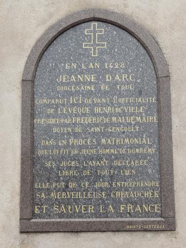 | View Original: | Toul (Meurthe-et-Moselle) Plaque Jeanne d'Arc, justice 1428.JPG (2736x3648) | |||
