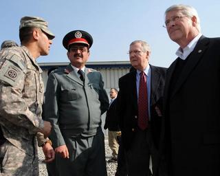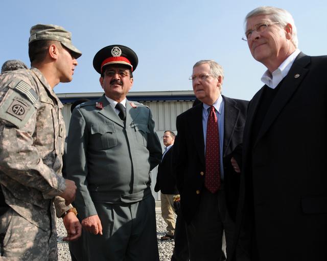 Keywords: Tour of Central Training Facility DVIDS240702.jpg en U S Army Spc Mohamad Azimi left translates for Afghan Brig Gen Khudadad Agah second from left commander Training Centers and U S Senators Roger F Wicker right and Mitch McConnell at the Central Training Facility Kabul Jan 9 2010 Sens Wicker and McConnell were joined by Sens Lisa Murkowski and Mike Crapo and Rep Michael Castle for a visit to CTC and other facilities in the area The Congressional delegation received briefings from CTC NATO Training Mission-Afghanistan and International Security Assistance Force senior leadership and met with Afghan national police officers while in the Kabul area The mission of NTM-A is to train the Afghan national security forces and enhance the government of the Islamic Republic of Afghanistan's ability to achieve a stable and secure country 2010-01-09 Chief Petty Officer Julian Carroll https //www dvidshub net/image/240702 100109-N-+++++-015 2010-01-17 14 08 KABUL AF PD-USGov-Military-Navy NATO Training Mission - Afghanistan Images from DoD uploaded by Fæ |