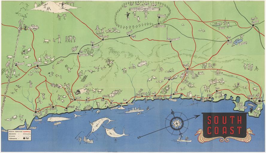 | Keywords: archives state records nsw staterecordsnsw newsouthwales 50th anniversary 50thanniversary maps tourism southcoast map tourist where's wheres wally text This plan is part of our gallery celebrating the 50th Anniversary of State Records Rail travel was a widely-used mode of transport for tourists and sightseers in New South Wales up to the mid-20th Century. The Railways cooperated with the Government Tourist Bureau to produce a variety of tourist literature to meet public demand. In the 1930s, Henry (Harry) J Weston, a cartoonist and commercial artist, seems to have been commissioned to do a series of tourist maps for various regions in New South Wales. The descriptions and photographs of key attractions (on the back of the maps) are fairly standard, but he brought a distinctive individual touch to the maps themselves, with various towns and regions highlighted by means of quirky drawings. This South Coast map, for example, has the NSW-Victorian border marked by a fence with two neighbours arguing across it. NRS 16407/1/2 Railway Tourist Guides, Maps and Souvenir Booklets, 1879-1946. South Coast for the tourist (36), by Henry J Weston, 1938. View on the Gallery » Rights: www.records.nsw.gov.au/about-us/rights-and-permissions We'd love to hear from you if you use our photos/documents. This plan is part of our gallery celebrating the 50th Anniversary of State Records Rail travel was a widely-used mode of transport for tourists and sightseers in New South Wales up to the mid-20th Century. The Railways cooperated with the Government Tourist Bureau to produce a variety of tourist literature to meet public demand. In the 1930s, Henry (Harry) J Weston, a cartoonist and commercial artist, seems to have been commissioned to do a series of tourist maps for various regions in New South Wales. The descriptions and photographs of key attractions (on the back of the maps) are fairly standard, but he brought a distinctive individual touch to the maps themselves, with various towns and regions highlighted by means of quirky drawings. This South Coast map, for example, has the NSW-Victorian border marked by a fence with two neighbours arguing across it. NRS 16407/1/2 Railway Tourist Guides, Maps and Souvenir Booklets, 1879-1946. South Coast for the tourist (36), by Henry J Weston, 1938. View on the Gallery ยป Rights: www.records.nsw.gov.au/about-us/rights-and-permissions We'd love to hear from you if you use our photos/documents. |