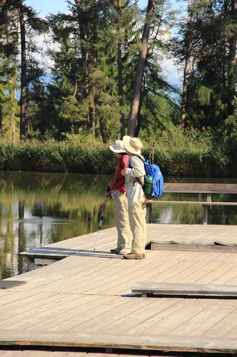 Keywords: tourists wanderer mountain walker tourism lake break viewing watch backpack sun hat