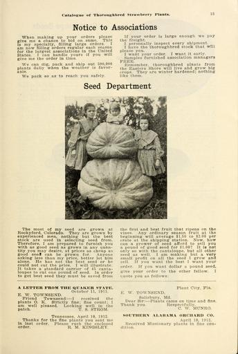 | Keywords: Townsend's 20th century catalog no. 22 explains why thoroughbred plants are the cheapest (16366514404).jpg Catalogue of Thoroughbred Strawberry Plants <br> 15 <br> Notice to Associations <br> When making up your orders please <br> give me a chance to bid on same This <br> is my specialty filling large orders I <br> am now filling orders regular each season <br> for the largest associations in the United <br> States I can handle yours if you will <br> give me the order in time <br> We can dig pack and ship out 500 000 <br> plants daily when the weather is favor- <br> aDle <br> We pack so as to reach you safely <br> If your order is large enough we pay <br> the freight <br> I personally inspect every shipment <br> I have the thoroughbred stock that will <br> please you <br> I want your order I want it early <br> Samples furnished association managers <br> FREE <br> Remember thoroughbred plants from <br> the Eastern Shore will live and grow big <br> crops They are winter hardened; nothing <br> like them <br> Seed Department <br> The most of my seed are grown at <br> Rockyford Colorado They are grown by <br> experienced men nothing but the best <br> stock are used in selecting seed from <br> Therefore I am prepared to furnish you <br> with as good seed as grows in any quan- <br> tity you may desire at prices as cheap as <br> good seed can be grown for Anyone <br> asking less than my price better let him <br> alone He has not the best seed or he <br> could not cut the price I will illustrate <br> It takes a standard carrier of 45 canta- <br> loupes to cut one pound of seed In order <br> to get best seed they must be saved from <br> the first and best fruit that ripens on the <br> vines Any ordinary season fruit at the <br> beginning will average 1 50 to 2 00 per <br> crate at the shipping station Now how <br> can a grower of seed afford to sell you <br> a pound of good seed for 1 00 It is not <br> only so with the cantaloupe but all other <br> seed as well I am making but a very <br> small profit on all the seed I grow and <br> ell If you want the best I want your <br> order If you want dollar a pound seed <br> give your order to the other fellow I <br> fiuote you as follows <br> A LETTER FROM THE QUAKER STATE <br> October 11 1911 <br> E W TOWNSEND <br> Friend Townsend ” I received the <br> plants O K Strictly fine; fine count; 1 <br> am well pleased Looking well in the <br> patch T S STROM <br> Tennessee April 10 1912 <br> Thanks for the fine plants you sent me <br> in last order Please rush the enclosed <br> order R M KINGSLEY <br> Plant City Fla <br> i W TOWXSEND <br> Salisbury Md <br> Dear Sir ” Plants came on time and fine <br> Thank you Respectfully <br> C W MUNRO <br> SOUTHERN ALAHAM V ORCHARD CO <br> April 10 1912 <br> Iveoeived Missionary plants in fine con- <br> dition 43830285 149342 78104 Page 15 Text http //www biodiversitylibrary org/page/43830285 1913 10 5962/bhl title 78104 E W Townsend Co ; Henry G Gilbert Nursery and Seed Trade Catalog Collection Biodiversity Heritage Library Townsend's 20th century catalog no 22 explains why thoroughbred plants are the cheapest it is not the number of acres you set but the number of quarts you get Catalogs E W Townsend Co Nurseries Horticulture Strawberries U S Department of Agriculture National Agricultural Library bhl page 43830285 dc identifier http //biodiversitylibrary org/page/43830285 bhlGardenStories e w townsend co nurseries horticulture u s department of agriculture national agricultural library bhlgardenstories Information field Flickr posted date ISOdate 2015-03-31 CC-BY-2 0 BioDivLibrary https //flickr com/photos/61021753 N02/16366514404 2015-08-23 22 08 07 cc-by-2 0 PD-old-70-1923 Townsend's 20th century catalog no 22 explains why thoroughbred plants are the cheapest Photos uploaded from Flickr by Fæ using a script |
