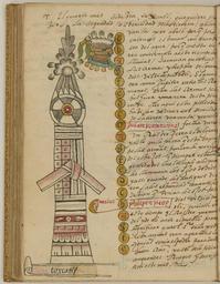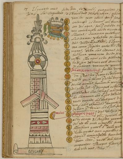 Keywords: Toxcatl, Drought, the Fifth Month of the Aztec Solar Calendar WDL6736.png Artwork ru Това Хуан де около 1546 г   около 1626 г fr Tovar Jean de 1546-1626 env en Tovar Juan de circa 1546-circa 1626 zh 胡安·德·托瓦尔,约 1546 年 - 约 1626 年 pt Tovar Juan de por volta de 1546-por volta de 1626 ar خوان دو توفار، حوالي 1546-حوالي 1626 es Tovar Juan de circa 1546-circa 1626 ru Тошкатль засуха 5-й месяц солнечного календа я ацтеков fr Toxcatl sècheresse cinquième mois du calendrier solaire aztèque en Toxcatl Drought the Fifth Month of the Aztec Solar Calendar zh 阿兹特克太阳历的第 5 个 干涸 pt Toxcatl Seca o quinto mês do calendário solar asteca ar توشكاتل، الجفاف، الشهر الخامس من التقويم الشمسي الأزتكي ru Кодекс Това а авто ом кото ого считается мексиканский иезуит XVI века Хуан де Това соде жит под обную инфо мацию об об ядах и це емониях ацтеков известных также как мешика Кодекс п оиллюст и ован 51 аква ельным исунком на полную ст аницу Рисунки в кото ых наблюдается значительное влияние пиктог афических укописей доколониальных в емен обладают исключительными художественными достоинствами Рукопись состоит из т ех азделов В пе вом азделе описана исто ия путешествий ацтеков до п ибытия испанцев Вто ой аздел п едставляет собой иллюст и ованную исто ию ацтеков В т етьем азделе находится календа ь Това а в кото ом п ослеживается календа ный цикл ацтеков с месяцами неделями днями воск есными буквами и елигиозными п аздниками х истианского 365-дневного года а этой иллюст ации из т етьего аздела изоб ажен инст умент кото ый п едставляет собой посох обмотанный к ашеной бумагой и увенчанный колесом Большой бумажный узел ук ашает ве х Сп ава на исован символ аск ашенное полосами лицо с белыми пе ьями на голове и в оже елье В тексте описано что Уицилопочтли бог солнца и войны подобен Юпите у для имлян Этот месяц оп еделяемый как май называется тошкатль засуха Богами-пок овителями этого месяца были Уицилопочтли и Тескатлипока бог ночного неба и памяти Изоб аженный инст умент <em> tlachieloni </em> или <em> itlachiaya </em> уст ойство для п осмот а п едставляет собой один из ат ибутов Тескатлипоки; считается что инст умент служил ему магическим зе калом Лицо аск ашенное полосами тоже является символом Тескатлипоки <br>Календа ь ацтеков; Боги ацтеков; Ацтеки; Календа и; Кодекс; Индейцы ексики; Ко енные на одности; езоаме ика; Кодекс Това а fr Le codex Tovar attribué à Jean de Tovar jésuite mexicain du XVI<sup>e</sup> siècle contient des informations détaillées sur les rites et les cérémonies des Aztèques également connus sous le nom de Mexicas Il est illustré de 51 aquarelles de la taille d'une page Fortement influencées par les manuscrits pictographiques de la période précontact ces peintures sont d'une qualité artistique exceptionnelle Le manuscrit est divisé en trois sections La première section contient une histoire des voyages des Aztèques avant l'arrivée des Espagnols La deuxième section est une histoire illustrée des Aztèques Dans la troisième section le calendrier de Tovar transcrit un calendrier aztèque continu avec les mois les semaines les jours les lettres dominicales et les fêtes liturgiques d'une année chrétienne de 365 jours Cette illustration extraite de la troisième section représente un instrument composé d'un bâton enveloppé de papiers peints et orné d'une roue à son sommet Un grand nœud de papier lie la partie supérieure droite le symbole d'un visage peint avec des rayures des plumes sur la tête et un collier est dessiné Le texte décrit Huitzilopochtli dieu du Soleil et de la guerre comme l'équivalent de Jupiter pour les Romains Ce mois assimilé à mai est appelé Toxcatl sècheresse Les dieux protecteurs de ce mois étaient Huitzilopochtli et Tezcatlipoca dieu du ciel nocturne et de la mémoire L'instrument représenté ici un <em>tlachieloni</em> ou <em>itlachiaya</em> instrument d'observation constitue l'un des attributs de Tezcatlipoca qui était censé lui servir de miroir magique Le visage peint avec des rayures est également un symbole de Tezcatlipoca <br>Calendrier aztèque; Dieux aztèques; Aztèques; Calendriers; Codex; Indiens du Mexique; Peuples autochtones; Méso-Amérique; Codex Tovar en The Tovar Codex attributed to the 16th-century Mexican Jesuit Juan de Tovar contains detailed information about the rites and ceremonies of the Aztecs also known as Mexica The codex is illustrated with 51 full-page paintings in watercolor Strongly influenced by pre-contact pict