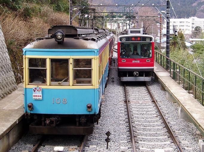 Keywords: Tozan cMc108 Mc2002 Kamiohiradai 20070308.jpg en Hakone Tozan Railway Type 2 No 108 and Type 2000 No 2002 in 2007 Hakone Tozan Type Moha 2 Hakone Tozan 2000 series