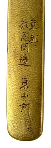 | Keywords: Tôzan - Kozuka with Flowers - Walters 5112933 - Mark A.jpg A large chrysanthemum and another flower decorate the front of the kozuka This is part of a mounted set between 1850 1912 Edo-Meiji gold silver shakudo cm 20 3 accession number 51 1293 3 13059 William T / Henry Walters Collection Baltimore date and mode of acquisition unknown Walters Art Museum Henry Walters Acquired by William T or Henry Walters Inscription Tôto oite Shinobugaoka atari; Translation in the area of Shinobugaoka Tokyo; Signature Tôzan koku; Translation carved by Tôzan place of origin Tokyo Shinobugaoka Japan Walters Art Museum license Tosogu Japanese sword fittings in the Walters Art Museum Media contributed by the Walters Art Museum needs category review Tôzan |