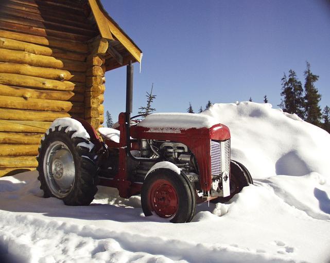 Keywords: tractor red log building wooden architecture beautiful winter season nature snow cold dry home wintry freezing farm equipment