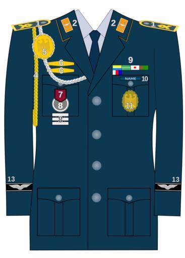 Keywords: Trageweise (Heer + Luftwaffe) (Luftwaffenfarben).svg en Not an official illustration Modification of File Trageweise Heer + Luftwaffe svg in the colours of the Luftwaffe Air Force Permissible Wearing of Orders decorations badges and markings on the uniform of the Army and Air Force 1 shoulder strap with insignia<br /> 2 collar patches<br /> 3 none<br /> 4 Company sergeant major CSM - Cord<br /> 5 German Armed Forces Badge of Marksmanship only Sgt and Enlisted <br /> 6 up to 2 activity badges and 1 foreign<br /> 7 internal Badge<br /> 8 up to 2 special badges and 1 foreign<br /> 9 ribbon bar<br /> 10 nameplate<br /> 11 Badge for Military Proficiency<br /> 12 none<br /> 13 Cuff title de Keine Offizielle Abbildung Abwandlung von File Trageweise Heer + Luftwaffe svg in den Farben der Luftwaffe Zulässige Trageweise von Orden Ehrenzeichen Abzeichen und Kennzeichnungen an der Uniform des Heeres und der Luftwaffe 1 Schulterklappe mit Dienstgradabzeichen<br /> 2 Kragenspiegel<br /> 3 entfällt<br /> 4 Kompaniefeldwebel KpFw - Schnur<br /> 5 Schützenschnur nur Uffz u Msch <br /> 6 bis zu 2 Tätigkeitsabzeichen davon 1 ausländisches<br /> 7 internes Verbandsabzeichen<br /> 8 bis zu 2 Sonderabzeichen davon 1 ausländisches<br /> 9 Bandschnalle<br /> 10 Namensschild<br /> 11 Leistungsabzeichen<br /> 12 entfällt<br /> 13 Ärmelband own Flor an 2012-09-02 Air Force dress uniforms of Bundeswehr Military decorations of Germany Bundeswehr Illustrations of methods of wearing orders decorations and medals Cc-zero