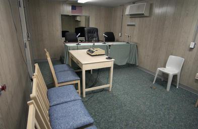 | Keywords: Trailer where CSR Tribunals were held.jpg  reads 07/29/2004 Guantanamo Bay Cuba - The facility where the Combatant Status Review Tribunals CSRT will take place for detained enemy combatants U S Navy photo by Photographer ™s Mate 1st Class Christopher Mobley PD-USGov-Military-Navy Imprisonment and detention Guantanamo Bay detainment camp legal and administrative proceedings Photos of Christopher Mobley ImageNote 1 2247 1287 170 94 3008 1960 2 It was standard operating procedure for all captives to have their hands and feet bolted to the floor ImageNoteEnd 1 ImageNote 2 397 1061 1078 896 3008 1960 2 These three chairs constituted the press gallery Members of the Press observed the unclassified sessions of 37 of the first 558 CSR Tribunals in 2004 and early 2005 An additional 20 CSR Tribunals were held for the new captives who arrived in 2006 2007 and 2008 The press were not invited to their Tribunals ImageNoteEnd 2  |