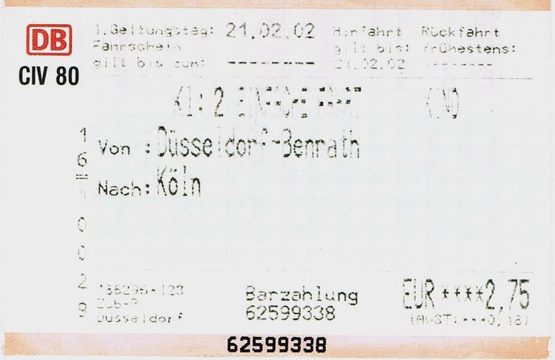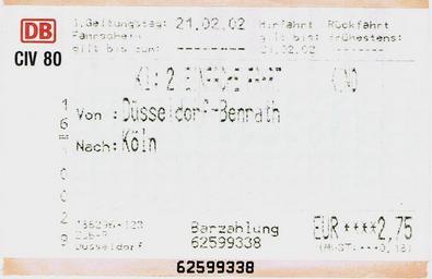 Keywords: Train ticket DB Düsseldorf-Benrath 2002.jpg Düsseldorf-Benrath to Cologne central station Köln Düsseldorf-Benrath nach Köln Hbf zu fahren own Saviour1981 2002-02-21 manufacture ; 2010-12-30 upload Rail tickets of the Deutsche Bahn February 2002 in Germany Düsseldorf-Benrath Transport in Cologne Public transport in Düsseldorf 2002 in Düsseldorf |