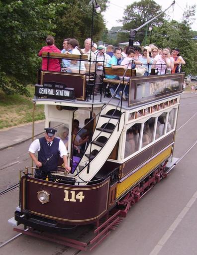 | Keywords: Tram in the Beamish Museum.JPG Tram No 114 on the tramway at Beamish Museum County Durham England It's seen here at the Home Farm stop viewed from the south operating a southbound journey This elevated view is from the top deck of a bus in the road that passes in between the tram passing loop and the shelter out of shot on the right Own 2006-07-29 Immanuel Giel other versions Tram No 114 Beamish Museum 29 July 2006 jpg Newcastle Corporation Tramways No 114 Double-decker trams 2006 in tram transport in the United Kingdom July 2006 in County Durham Open-top trams |