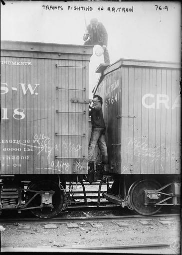 | Keywords: Tramps Fighting Between Carriages.jpg en Tramps fighting between railroad cars 2012-09-29 03 22 00 http //www loc gov/pictures/item/ggb2004000406/ Library of Congress Custom license marker 2012 09 28 PD-USGov Uploaded with UploadWizard Train surfing in the United States Freight car surfing Between wagons riding trains Roof riding trains History of train surfing Opponents of train surfers Fighting | ||||