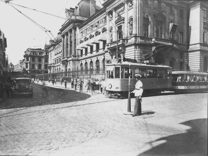 | Keywords: Tramvai electric pe linia 20.jpg ro Tramvai electric pe linia 20 1929 in zona Strazii Doamnei nu departe de str Lipscani La dreapta Banca Nationala a Romaniei B-II-m-A-19023 www ratb ro; a version of this photo can be seen at http //www ratb ro/index php page meniu id_rubrica_meniu 13 Author ca 1936 PD-old anonymous-EU 1936 in Bucharest Trams in Bucharest Police handling traffic National Bank of Romania old building Bucharest Police officers of Romania Law enforcement in Bucharest 1936 in tram transport Black and white photographs of trams |