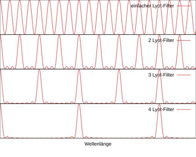 Keywords: Trans.svg en Theoretical transmission of four successively applied Lyot filter The lyot filter have half of the width of the previous one own Svebert 2011-05-14 Cc-zero Optical filters