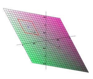 Keywords: Transformation (before).png This image is part of a collection of 2 plots of mathemical function other image Transformation_ after png They show a strongly non-linear w transformation mathematics being applied to a simple function a plane through the origin The plane is transformed into a a curved surface legend ;blue dot reference point ;red dots reference square ;green dots the reference square transformed by a w linear approximation of the non-liear transformation created with Maple 10 using the following code <code> <pre> > restart with VectorCalculus with plots with plottools z x y ->sin 1/2 x 2-1/4 y 2+3 cos 2 x+1-exp y > z x y ->x+y/2 > t1 u v w -> exp u+v exp u-v cos w ; > ti t1 x y z ; > bt x y z x y ; > bl t1 bt ; > pc 1/2 1/2; > p0 pc1 pc2 z pc1 pc2 ; > myunit 0 3; > circum map p->p1 p2 z p1 p2 pc+myunit i/10 myunit i -10 10 pc+-myunit i/10 myunit i -10 10 pc+i/10 myunit myunit i -10 10 pc+i/10 myunit -myunit i -10 10 > i0 evalf t1 p0 ; > display plot3d x y z x y x -1 2 1 2 y -1 2 1 2 axes normal point p0 color blue symbol circle symbolsize 10 'point circumi color red symbol circle symbolsize 2 ' 'i' 1 nops circum ; > display plot3d bl x -1 2 1 2 y -1 2 1 2 axes normal point i0 color blue symbol circle symbolsize 10 'point t1 circumi color red symbol circle symbolsize 2 ' 'i' 1 nops circum ; > J Jacobian ti x y z ; > lindiff Matrix eval J x p01 y p02 z p03 ; > tl u v w ->convert lindiff Vector u v w list ; > evalf tl 0 0 0 ; > evalf t1 p0 ; > linapp map c->evalf i0+tl c-p0 circum > display plot3d bl x -1 2 1 2 y -1 2 1 2 axes normal point i0 color blue symbol circle symbolsize 10 'point t1 circumi color red symbol circle symbolsize 2 ' 'i' 1 nops circum 'point linappi color green symbol circle symbolsize 2 ' 'i' 1 nops circum ; > display 'point linappi-t1 circumi color green symbol circle symbolsize 2 ' 'i' 1 nops circum ; </pre> </code> transformations geometry Surface plots Maple diagrams |
