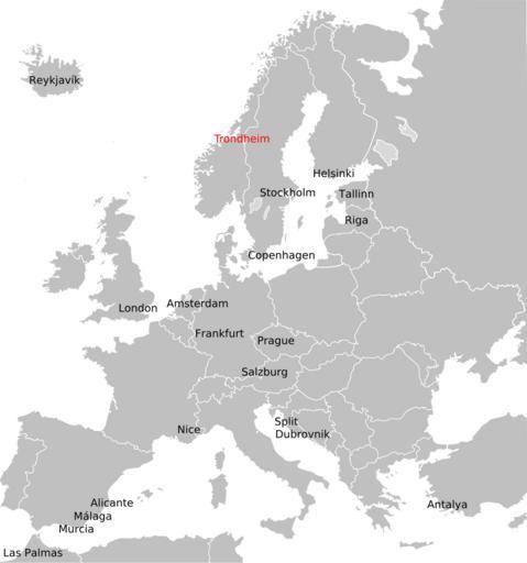 Keywords: TRD destinations map.svg en International destinations from Trondheim Airport Værnes own Alasdair McLellan 2010-02-13 Maps of cities served by flights from given airport Aviation maps of Norway Trondheim Airport Værnes