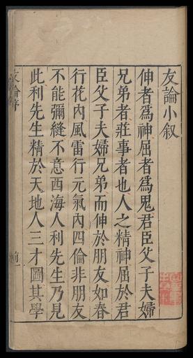 | Keywords: Treatise on Friendship WDL11404.jpg Artwork ru Риччи аттео 1552-1610 гг fr Ricci Matteo 1552-1610 en Ricci Matteo 1552-1610 zh 利玛窦,1552-1610 年 pt Ricci Matteo 1552-1610 ar ريتشي، ماتيو، 1552-1610 es Ricci Matteo 1552-1610 ru Т актат о д ужбе fr Traité sur l'amitié en Treatise on Friendship zh 友论 pt Tratado sobre a amizade ar دراسة في الصداقة ru Работа <em> Ю лунь </em> Т актат о д ужбе имеющая еще один заголовок <em> Цзяо ю лунь </em> Т актат о том как заводить д узей написана иезуитским миссионе ом аттео Риччи 1552 1610 гг соп оводившим ее также заголовком на латыни <em> De Amicitia </em> В т актате ассчитанном на ядового нех истианского китайского читателя под обно излагается идея доб одетельной д ужбы Эта абота от ажает попытки Риччи пе енести в Китай культу у Воз ождения и гуманизма Как сообщается в <em> Сы ку цюань шу ти яо </em> Библиог афия импе ато ской библиотеки с коммента иями данная абота была екомендована Цюй Жукуем одился в 1549 году членом известной семьи чиновников и ученых из Чаншу п овинция Цзянсу и одним из последователей Риччи п инявшим к ещение в 1605 году в анкине Т актат одился из бесед Риччи о д ужбе с Чжу Доцзе 1573 1601 гг п инцем Цзянь-аня Это была пе вая абота Риччи на китайском языке Т актат включает пе еводы или пе есказы текстов и высказываний западных святых и муд ецов п едставленные в п ивычной для китайских ученых фо ме Он соде жит 100 максим в 3 500 словах 76 из кото ых были соб аны Риччи анее а остальные добавлены позже В п едисловии к аботе Риччи описывает адушие п инца Цзянь-аня кото ый по окончании банкета сп осил у него что жители Запада думают о д ужбе аксимы никак не сг уппи ованы их можно читать по-отдельности независимо д уг от д уга С еди авто ов п оцити ованных Риччи были А истотель Плута х Цице он и Сенека а также х истианские мыслители такие как Амв осий иланский и Августин Блаженный Книга была хо ошо вст ечена китайскими учеными кото ые с инте есом ее п очитав были по ажены способностью Риччи к написанию книг екото ые максимы были п оцити ованы в аботах ученых конца эпохи ин в том числе та в кото ой гово ится ой д уг это не д угой человек ой д уг это половина меня мое вто ое я Поэтому я должен относиться к д угу как к самому себе Судя по всему у Риччи был талант обзаводиться д узьями кото ых за годы миссионе ства в Китае у него появилось очень много <br>Д ужба Цитаты из ечения и т д ; Иезуиты fr <em>You lun</em> Traité sur l'amitié également intitulé <em>Jiao you lun</em> Traité de la relation amicale fut écrit par le missionnaire jésuite Matteo Ricci 1552 1610 qui ajouta le titre en latin <em>De Amicitia</em> Destiné aux lecteurs chinois non chrétiens le livre aborde en détail le concept de l'amitié vertueuse et il reflète les efforts de Ricci pour introduire la Renaissance et la culture humaniste en Chine Selon <em>Si ku quan shu ti yao</em> Bibliographie annotée de la bibliothèque impériale l'ouvrage fut recommandé par Qu Rukui né en 1549 membre d'une éminente famille de fonctionnaires et d'érudits de Changshu dans le Jiangsu et l'un des premiers disciples de Ricci qui fut baptisé en 1605 à Nanjing Le traité fut le fruit des discussions sur l'amitié entre Ricci et Zhu Duojie 1573 1601 prince de Jian'an Il s'agit du premier ouvrage écrit en chinois par Ricci Le traité contient des textes traduits ou paraphrasés ainsi que des aphorismes de saints et de sages occidentaux dans un format facilement reconnaissable pour les érudits chinois Il comporte 100 maximes soit 3 500 mots Soixante-seize d'entre elles furent initialement collectées par Ricci et le reste fut ajouté par la suite Dans sa préface Ricci décrit l'hospitalité du prince de Jian'an qui lui demanda à la fin d'un banquet ce que les Occidentaux pensaient de l'amitié Les maximes qui ne sont pas regroupées dans des catégories particulières peuvent être lues indépendamment sans référence les unes aux autres Ricci cite des auteurs tels qu'Aristote Plutarque Cicéron et Sénèque et des penseurs chrétiens comme les saints Ambroise de Milan et Augustin d'Hippone Le livre fut bien accueilli par les érudits chinois qui le lurent d'abord par curiosité puis furent impressionnés par l'écriture de Ricci Des maximes furent citées dans des ouvrages d'érudits de la fin de la dynastie Ming dont celle-ci « Mon ami n'est pas une autre personne Mon ami