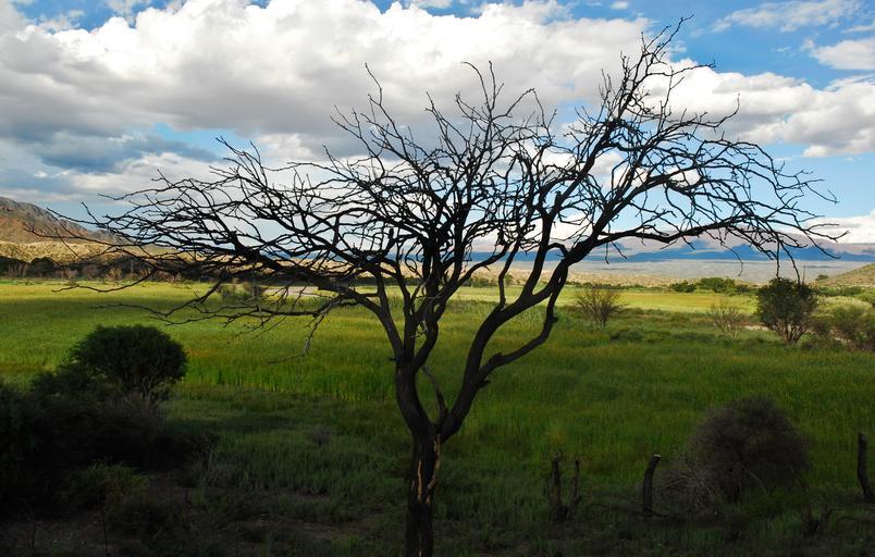 Keywords: tree branches dark woods trunk woody stems wooden white clouds cloudy fluffy blue sky green grass plants lawn landscape scenic scenery