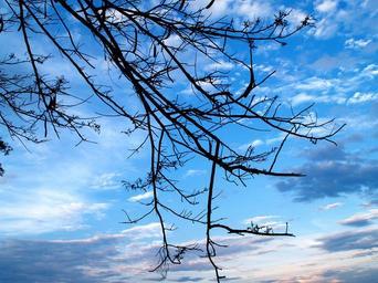 Keywords: tree branches silhouette sky blue white clouds plants dark bright day cloudy fluffy cloudscape nature atmosphere