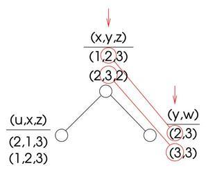 Keywords: Tree-decomposition-4.svg Every node of the tree in Image Tree-decomposition-2 svg is made a variable Its domain is the set of all solutions of the relative subproblem found as for example in Image Tree-decomposition-3 svg The constraint of this new problem equates all copies of the old variables In this example only equality of y between the root and its right child is shown but equality of x and z between the root and its left child is also enforced Constraint satisfaction 2006-04-14 own assumed Tizio |
