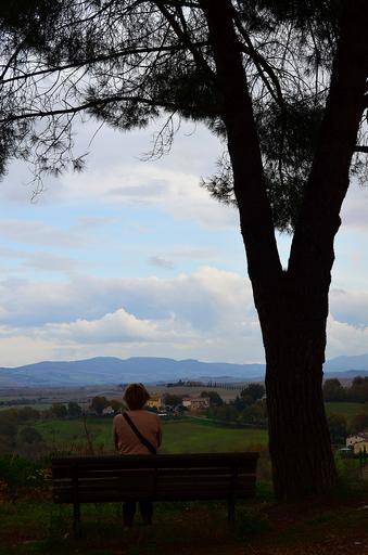 MAKE A MEME View Large Image tree man bench far away mountains hills italy tuscany clouds sky day summer nature
