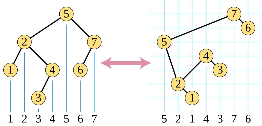 Keywords: Tree permutation bijection.svg binary trees with nodes labeled in left-to-right order and stack-sortable permutations generated by listing the same node labels in preorder 2016-03-21 own David Eppstein other versions cc-zero Binary trees Permutations |