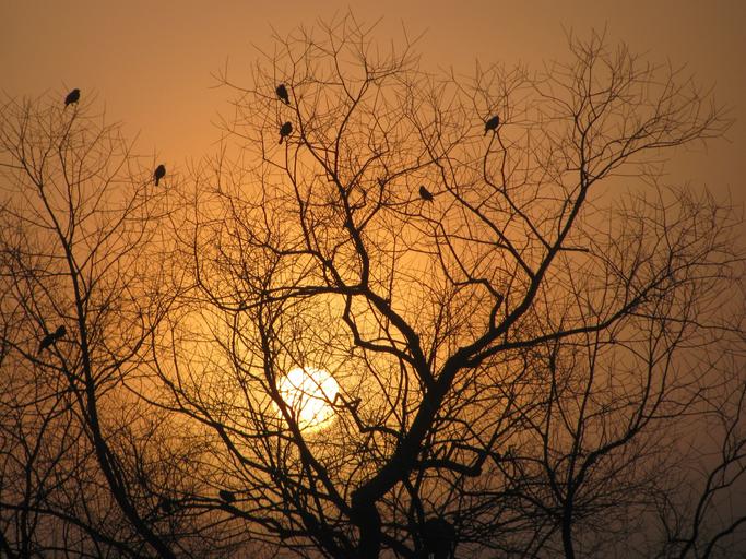 Keywords: tree silhouette sunrise branches birds in trees sunlight spring willow tree