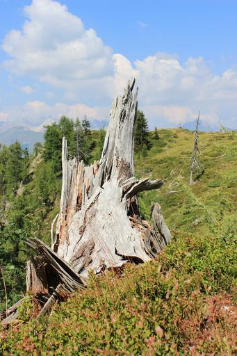 Keywords: tree stump mountain landscape vermoderndes wood pasture forest mountains dry root green field sky clouds trees