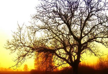 Keywords: tree sunrise light rays beautiful sky clouds orange red still nature landscape rest dusk sunbeam