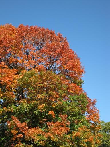 Keywords: trees autumn leaves red green orange leafy branches foliage plants stems blue sky clear fall seasons perennials nature natural scenic scenery environment gardens october woods woody