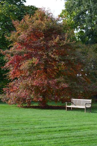 Keywords: trees autumn park red leaves foliage leafy gardens greenery lawns benches white woods woody plants flora gardening nature natural environments fall seasons