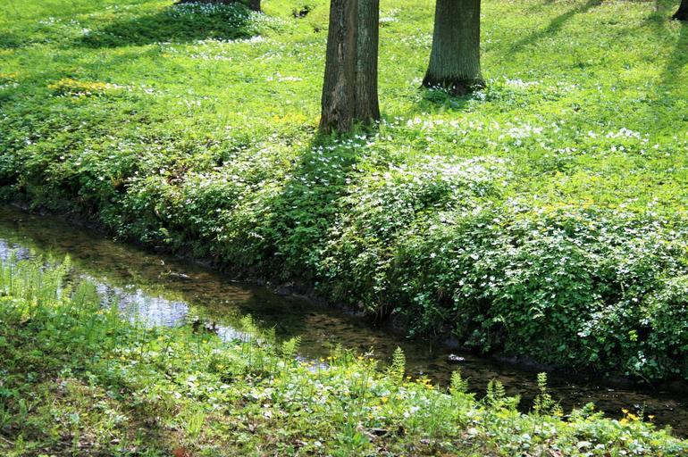 Keywords: trees furrow stream water grass green