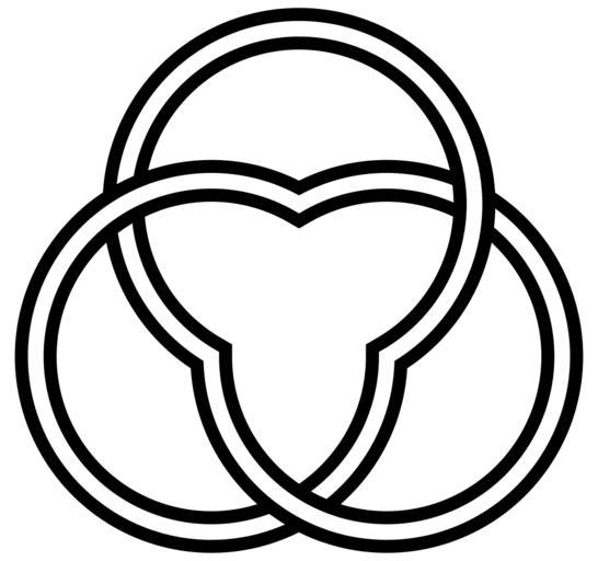 Keywords: Trefoil-Triquetra.svg An architectural trefoil i e symmetrical pattern of three partially-overlapping circles which is also a triquetra i e simple threefold closed knot Consists of three 300° circular arcs For non-interlaced architectural trefoil see File Trefoil-Architectural png etc Self-made graphic converted from the following PostScript source code <pre> 306 396 translate 4 dup scale/x 201 9613115 -116 6025 403 9226231 def/B 1 setgray 36 setlinewidth x 180 120 arc gsave 0 setgray 96 setlinewidth stroke grestore stroke def gsave B 2 -120 rotate B repeat grestore/A 96 setlinewidth 0 setgray x 230 251 arc stroke 1 setgray 36 setlinewidth x 229 252 arc stroke def A 2 120 rotate A repeat showpage EOF </pre> 2010 AnonMoos thumb center Artistic example Trefoils in architecture Interlaced triquetra Trefoil knot diagrams with 3-fold rotational symmetry Decorative knots Images with PostScript source code Knots and links on transparent background Outline knots and links