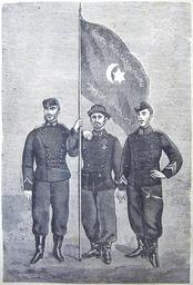 Keywords: Trei-Voinici-Resboiul-prima-pagina-18-septembrie-1877.jpg en Three Romanian soldiers of the 1877-1878 Romanian War of Independence with an Ottoman flag captured during the Siege of Plevna 20 July “ 10 December 1877 Print from the front page of newspaper Resboiul September 18th 1877 The accompanying article in Romanian Iacă cei trei voinici din Batalionul al 2-lea de vânători dintre cei care s-au distins în luptele de la Plevna Cel din mijloc este soldatul Grigore Ion din districtul Prahova care a luat stindardul împuscându-l pe Turcul care fugea cu dânsul; cel din stânga este sergentul iar cel din dreapta este caporalul care au sărit în ajutorul soldatului Grigore Ion ÃŽn ziua de 3 Aug batalionul al 2-lea de vânători a fost cel dintâi care s-a apropiat de întăririle turceÅŸti înaitând ca tiraliori ÃŽndată după vânători urmau ÅŸi celelalte trupe de linie ÅŸi dorobanÅ£ii cu scări ÅŸi alte unelte pentru a se putea urca pe redutele îndesate cu hordele sălbatice ale lui Osman PaÅŸa care trăgeau mereu cu puÅŸti ÅŸi tunuri contra bravilor noÅŸtri soldaÅ£i După cea mai crâncenă rezistenţă trupele turceÅŸti a trebuit să se retragă lăsând posiÅ£ia lor întărită în mâinile Românilor Pe când Turcii se retrăgeau s-a întâmplat incidentul luărei stindardului Iacă cum narează însuÅŸi curagiosul nostrul vânător Grigore Ion luarea acelui glorios trofeu Eram înainte GlonÅ£ele ploau ca piatra Turcii erau la trei sute de paÅŸi se gătiau de retragere Eram ˜naintea celor alÅ£i voiam să ucid un Turc cu baioneta De o dată văd un alt turc spătos ˜naintea mea fugind cu un steag ÃŽl ochesc el cade; mă arunc pe el când voia să descarce revolverul; îi înfig baioneta în pept ÅŸi trag steagul Turcul muria dar îl Å£inea strâns Mă silesc să ˜i ™l smulg Atunci doi turci se aruncară asupră ™mi Mă pun în apărare; din fericire sergentul ÅŸi caporalul meu îmi vin în ajutor Culc la pământ un Turc ei culcă la pământ pe celălalt ÅŸi eu am smuls steagul 1877-09-18 http //resboiu ro Resboiul other versions PD-old-70-1923 Romanian War of Independence Vânători de Munte