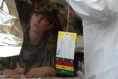 | Keywords: Triage Card DVIDS55619.jpg  en A triage card which all of the volunteers playing simulated causalities hold helps the medics sort the casualties by precedence for evacuation during the training exercise on Aug 23 Members of the National Guard from all around the state and civilian volunteers participated in a Chemical Biological Radiological Nuclear and High Yield Explosive CBRNE Enhanced Response Force Package CERF-P training in preparation for certification The Minnesota National Guard is establishing a new emergency response team to provide immediate capabilities to the governor including incident site search capability of damaged buildings rescuing trapped casualties providing decontamination and performing medical triage and initial treatment to stabilize patients for transport to medical facilities 2007-08-23 Staff Sgt Lynette Olivares https //www dvidshub net/image/55619 55619 2007-09-06 16 55 MINNEAPOLIS MN US PD-USGov Minnesota National Guard Images from DoD uploaded by Fæ |