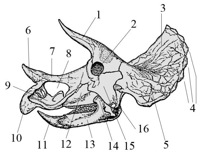 | Keywords: Triceratops prorsus old skull003.png en Part of the skull of Triceratops Triceratops prorsus Postorbital horn core brow horns Orbital eye socket Parietal Epoccipitals scallops Squamosal Nasal horn core nose horn Nasal Nostrail Premaxilla Rostral Predentary Maxilla Dentary Coronoid Jugal Epijugal 2011-05-20 File Triceratops prorsus old skull001 png Charles Othniel Marsh processed by User MathKnight and Zachi Evenor PD-old-100 PD-US Uploaded with UploadWizard Triceratops skulls Triceratops on white background Dinosauria skeletal diagrams |