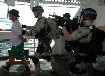 Keywords: Trident Fury Exercise DVIDS1083428.jpg en SEATTLE- Petty Officer Third Class Jacob Hymer Petty Officer Second Class Matthew Fink and Petty Officer Third Class Joshua Vanhooser members of a boarding team from the Navy vessel USS Ingraham FFG-61 homeported in Everett Wash escort Ensign Ed Quinn of the Coast Guard Cutter Alert homeported in Astoria Ore during a drill Wednesday Ten members of the Alert's crew were hidden aboard the vessel playing the role of smugglers attempting to transport weapons and other contraband to an enemy nation as part of the Trident Fury exercise on the waters west of Vancouver Island B C Trident Fury is a joint training exercise developed by Canada's Joint Task Force Pacific Headquarters for the purpose of building a strong working relationship between the maritime and aviation forces of the United States and Canada 2005-08-21 https //www dvidshub net/image/1083428 1083428 2013-12-11 20 10 SEATTLE WA US PD-USGov USS Ingraham FFG-61 Images from DoD uploaded by Fæ |