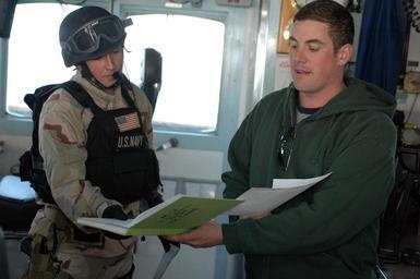 Keywords: Trident Fury Exercise DVIDS1083429.jpg en SEATTLE - Chief Greg Zerfass of the Coast Guard Cutter Alert homeported in Astoria Ore hands ship's documents over to Ens Benjamin Anderson a member of a boarding team from the Navy vessel USS Ingraham FFG-61 homeported in Everett Wash during a drill Wednesday Ten members of the Alert's crew were hidden aboard the vessel playing the role of smugglers attempting to transport weapons and other contraband to an enemy nation as part of the Trident Fury exercise on the waters west of Vancouver Island B C Trident Fury is a joint training exercise developed by Canada's Joint Task Force Pacific Headquarters for the purpose of building a strong working relationship between the maritime and aviation forces of the United States and Canada 2005-08-21 https //www dvidshub net/image/1083429 1083429 2013-12-11 20 10 SEATTLE WA US PD-USGov USS Ingraham FFG-61 Images from DoD uploaded by Fæ |