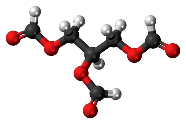 Keywords: Triformin 3D ball.png Ball-and-stick model of the triformin molecule the triglyceride of formic acid Colour code 505050 Carbon C black<br> F0F0F0 Hydrogen H white<br> F51E1E Oxygen O red<br> 2011-07-03 own DS Visualizer Jynto talk Space-filling version cc-zero Images by Jynto Formate esters Triglycerides |