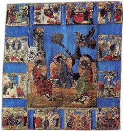 Keywords: Trinity (Sergiev Posad, 15th c).jpg Т оица с п аздниками Суда ь 2-я половина XV в ате иал Камка шелковые золотные и се еб яные нити есто х анения Се гиево-Посадский госуда ственный исто ико-художественный музей-заповедник П оисхождение П оисходит из Т оице-Се гиевой лав ы Разме 55 х 51 Сох анность и естав ация Изоб ажения п и естав ации 1951 г пе еложены на синюю к ашенину Описание а с еднике пелены изоб ажена ветхозаветная Т оица По каймам све ху слева нап аво 1 Благовещение 2 Рождество 3 С етение 4 К ещение 5 П еоб ажение 6 Воск ешение Лаза я 7 Вход в Ие усалим 8 Распятие 9 Сошествие во ад 10 Вознесение 11 Сошествие святого духа на апостолов 12 Успение Богомате и Все шито азноцветными шелками в аскол имбы конту ы складки одежд надписи и д угие детали - золотом Пе воначальные фоны - ко ичневая камка на с еднике и песочная на каймах - не сох анились и видны лишь в местах ут ат шитья http //lib pstgu ru/icons/index2 php option com_content view article id 1292433285 3C 2-я половина XV в anonymous Embroidery in Museum of Sergiev Posad 15th-century Russian orthodox embroidery Files uploaded by Shakko from various sources Old Testament Trinity PD-old-100