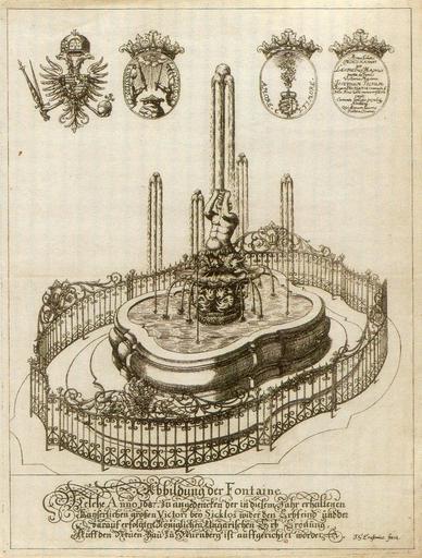 Keywords: Triton Fontain.JPG Triton Fountain in Nuremberg 1687 Engraving by Johann Georg Erasmus Source Robin Halwas Ltd London Cat 6 2005 p 41 Die Darstellung zeigt den massiven Sandstein-Triton-Brunnen der von Leonard Bromig geschaffen wurde und 1689 zur Erinnerung an die Siege Kaiser Leopolds I gegen die Türken im Sommer 1677 und die Krönung seines Sohn Joseph zum König von Ungarn am 9 12 1687 im Neuen Bau in Nürnberg aufgestellt wurde PD-Art Tritonbrunnen Nuremberg 1687 in Nuremberg Artworks missing infobox template |